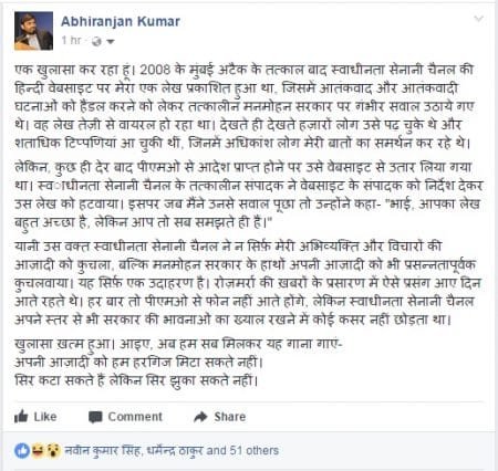 वरिष्ठ पत्रकार अभिरंजन कुमार ने अपनी फेसबुक वॉल पर एक सनसनीखेज खुलासा किया है। किसी चैनल का नाम लिए बगैर उन्होंने दावा किया है कि 2008 में मुंबई पर हुए आतंकवादी हमलों के बाद जब अपने एक लेख में उन्होंने तत्कालीन मनमोहन सरकार की नीतियों पर सवाल उठाए, तो चैनल ने पीएमओ के निर्देश पर उस लेख को अपनी वेबसाइट से हटा लिया था।